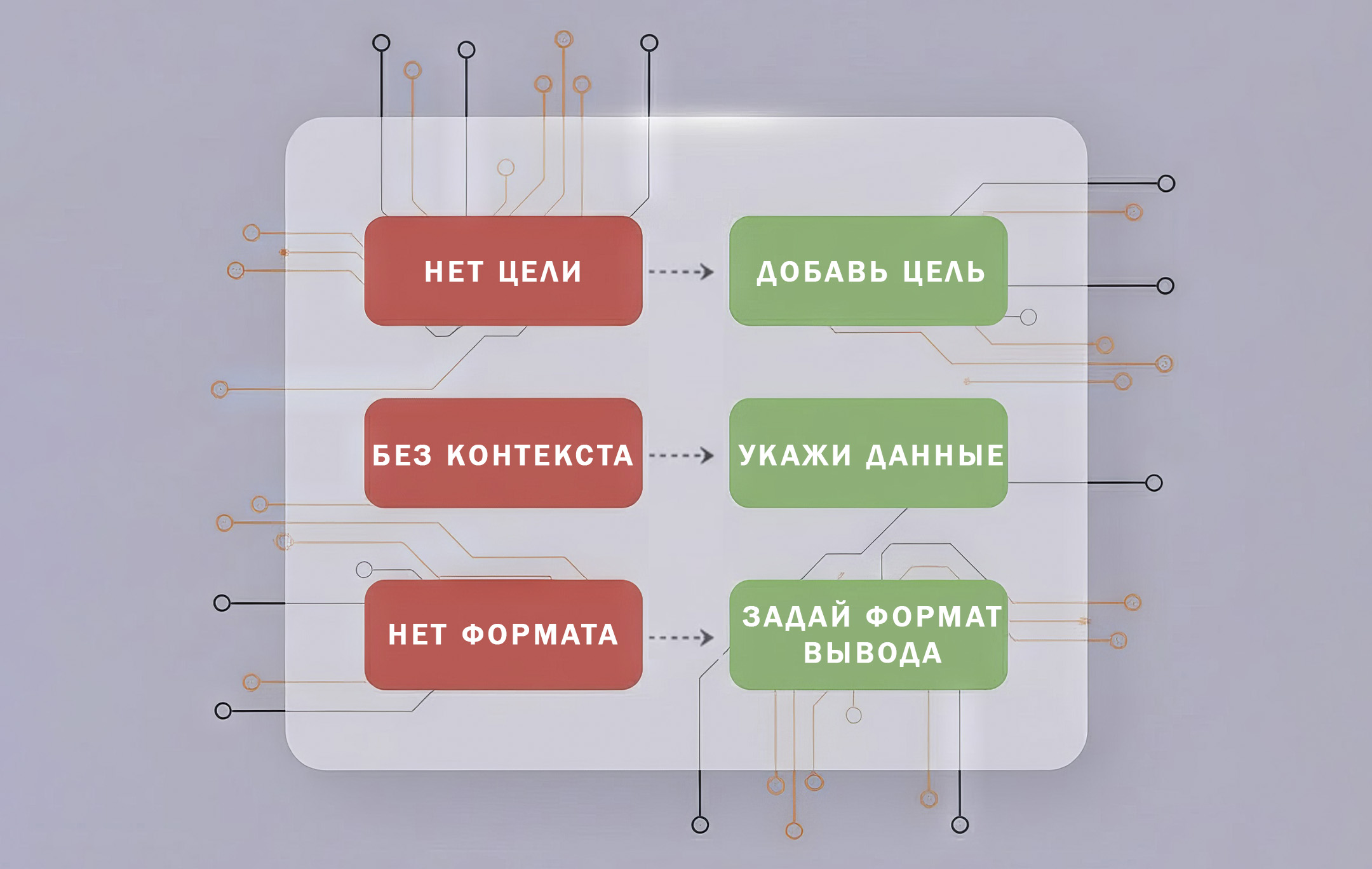 Суть в том, чтобы избегать длинных фраз без смысла и всегда давать нейросети четкий каркас для ответа. Без такого формата и проверки на адекватность запроса, диалог превращается в разговор глухих.