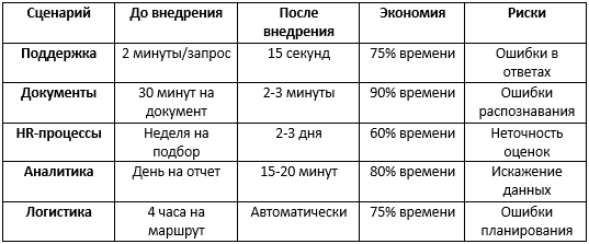 - Клиентская поддержка: Автоответы на 60-80% вопросов (Метрика: Скорость ответа).